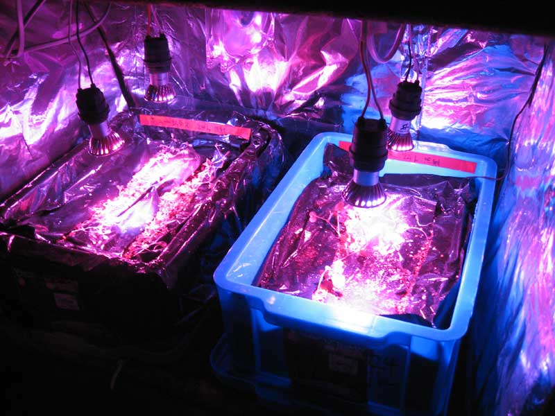 そんな時、椎茸菌床ブロックが到着。開封すると菌床ブロックは既に幾つか発芽していました。全部で4個のブロックのうち、ひとつは青色LEDをセット。ひとつは光のない状態のものをセット。ひとつは光のない状態で植物工場外の寒い環境にセットしました。そして残るひとつは専門校の教室内に置く事にしました。椎茸の菌床ブロックについて調べていた仲間が菌床ブロックに水分を与えます。しばらくおいて各々のセットポジションに設置しました。条件が4通りありますが、約1週間から10日ほどの間にどの条件の椎茸が良好な生育をするのか観察して行く事になります。