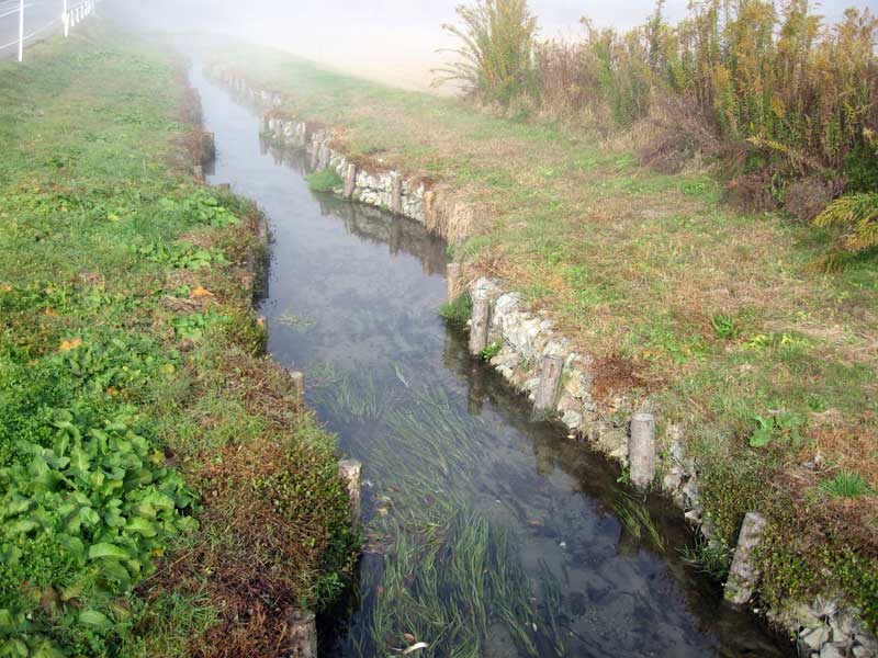 今日はバイオ農業チームの植物工場実験設備準備の為に直接現場へ向かいました。濃い霧が立ちこめ、自転車を走らせると冷たい風が顔に吹き付けます。通りかかったのは、今時珍しい小川です。何かと言うとコンクリートでまっすぐに護岸を固めてしまいがちですが、この小川は護岸を石組で構成していて、敢えて蛇行させている様です。湧水地としても知られる地域ですから水との関わりや意識も違うのかも知れません。