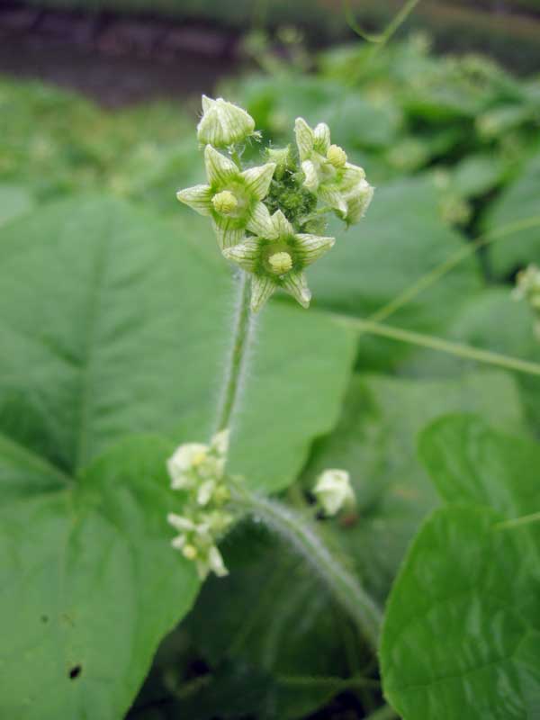 そんな雨に濡れる植物の中にアレチウリの花を見つけました。アレチウリは以前にコンペイ糖の様な形をした実を不思議に思って調べたのですが、帰化植物であり繁殖力が強いため全国的に問題になっているそうです。一見ウリやカボチャの葉に似ている為、誰かが植えたものではないかと思ってしまいます。ただ、帰化植物であっても日本の昆虫等の生物と上手くやっているようで生態系の中に溶け込んでいる様です。