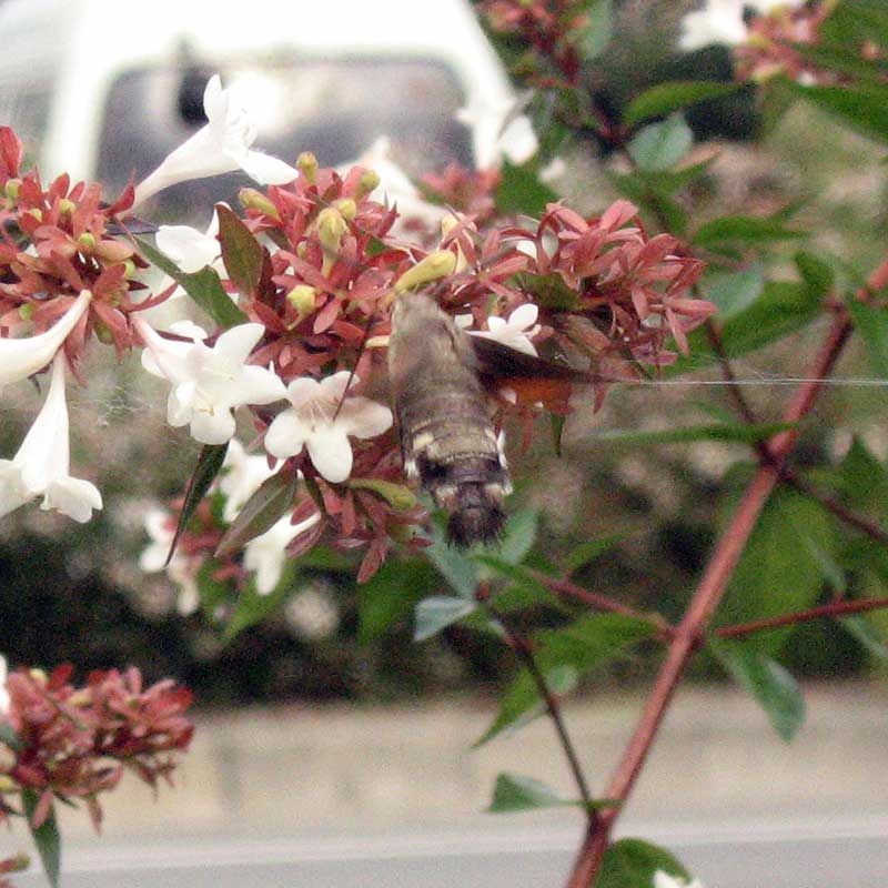 風が涼しくなったようですね。自転車で通りかかった道端の植え込みの花が咲いていました。ツクバネウツギの様です。そこで飛んでいる昆虫を見つけて自転車を下りました。それはスズメガの仲間です。10日程前にイモムシが歩いていた場所のすぐ近くです。高速で飛翔しているので特定するのが難しいですが、セスジスズメではないようです。速過ぎて写真を撮るのも容易ではありませんでした。他にもクマバチやアゲハチョウの姿も見られます。ほのかに甘い香りが漂っていました。