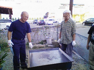 見学が終わって、今日は芋煮会と称して親睦会がありました。先刻のプレノアールの丸焼きもところ狭しとテーブルに並べられ次々と参加者の胃袋へ収まって行きます。