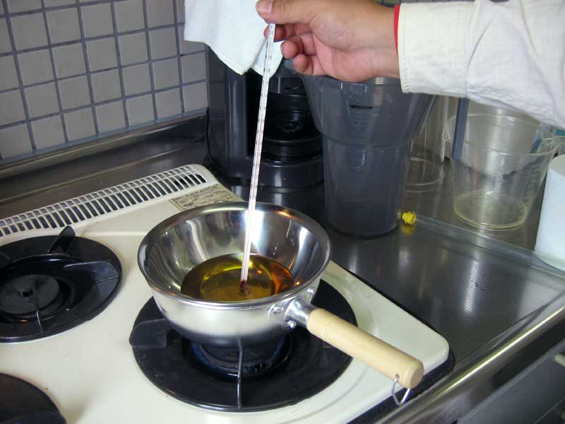 今日の訓練校は、昨日に引き続き受験コースと実践コースに分かれて活動でした。実践コースはBDFの実験で固形化にチャレンジです。まずは純石鹸を細かくする所からスタートです。きっちり重さを量り、湯煎にかける為、お湯でBDFを温めます。温度を計測し、頃合いを見計らって細かくした石鹸を投入しました。それからしばらく石鹸が溶けやすい様にかき混ぜました。しかし、なかなか溶けません。さらに混ぜ続けます。でもやっぱり溶けません。これは俗に言う失敗でしょうか。