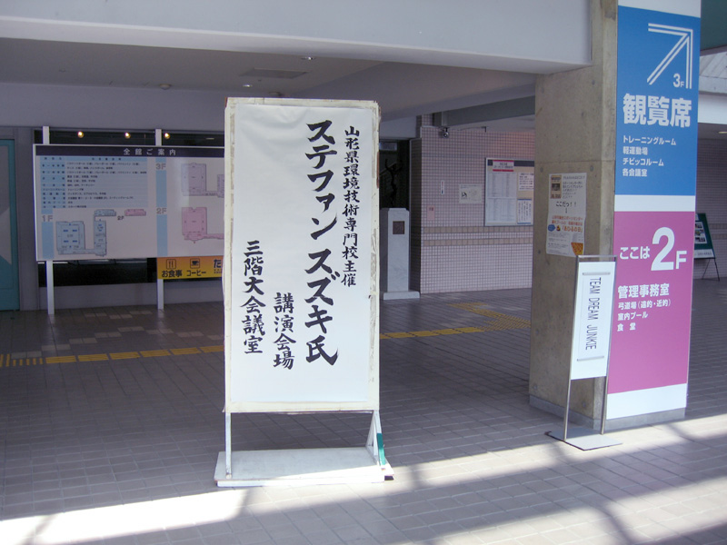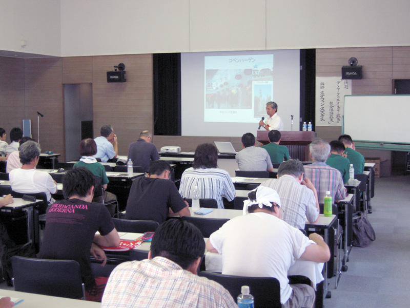 午後は山形市総合スポーツセンターに会場を移動して特別講義です。自然エネルギーの講義をしていただいている丹 省一先生のご御紹介ではるばるデンマークからステファン・スズキ先生の講義を受けることが出来ました。