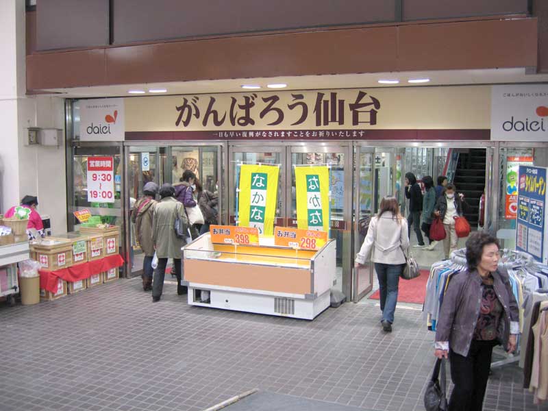 IMG_5356.jpg 食後、駅周辺を散策してみました。アーケード街の溢れ返る人の波を見ていると既に日常を取り戻している様に見えます。物資も充分に満たされている様です。宮城県外からの人も多いそうです。震災の影響を考慮して学生の春休みが長くなったので、大学生のボランティアが多いとか。このエネルギーを復興に向ければ、強力なマンパワーになる様に感じました。震災の影響で元気がなくなっている事を想像していたので若干圧倒されつつ、仙台は頑張っていますと言うメッセージを受け取って来た様な気がします。