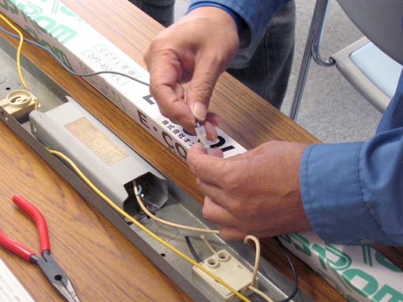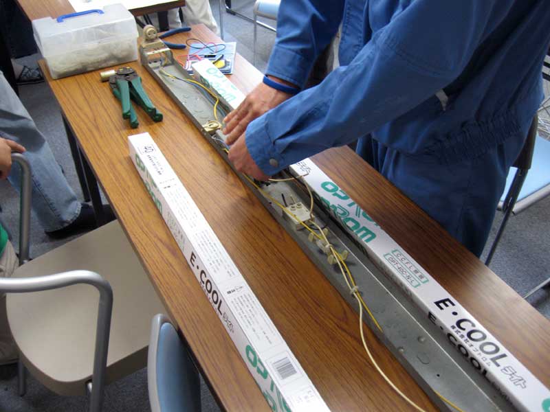 OJTコースはCCFLという蛍光管の交換実習でした。CCFLはLEDと違って蛍光管を細くした様な感じで、印象としてはネオン管のような感じです。細い発光管の中にはガスが充填されていて水銀原子を励起させて発生させた紫外線を可視光に変換すると言う高度な技術が使われている様です。液晶のバックライトに多用されていると言うことです。さて、今回は交換作業と言うことで城西電工さんの御協力を得て実習となりました。手始めに単管の配線を繋ぎ替えて解説して頂きました。慣れない作業でしたが、サクサクと出来てしまう人もいてなかなかに頼もしいです。次いで、二本の蛍光管の配線なのですが、これがなかなか複雑です。解説をしていただきましたが、やっぱり実習が必要でしょう。実際は天井を見上げたままでの作業になる為、何度も経験を重ねることが必要になるでしょう。