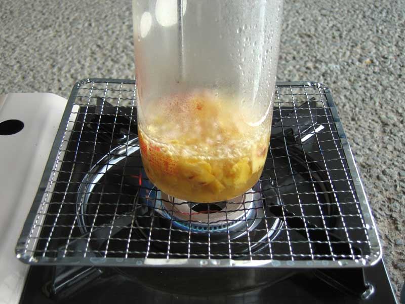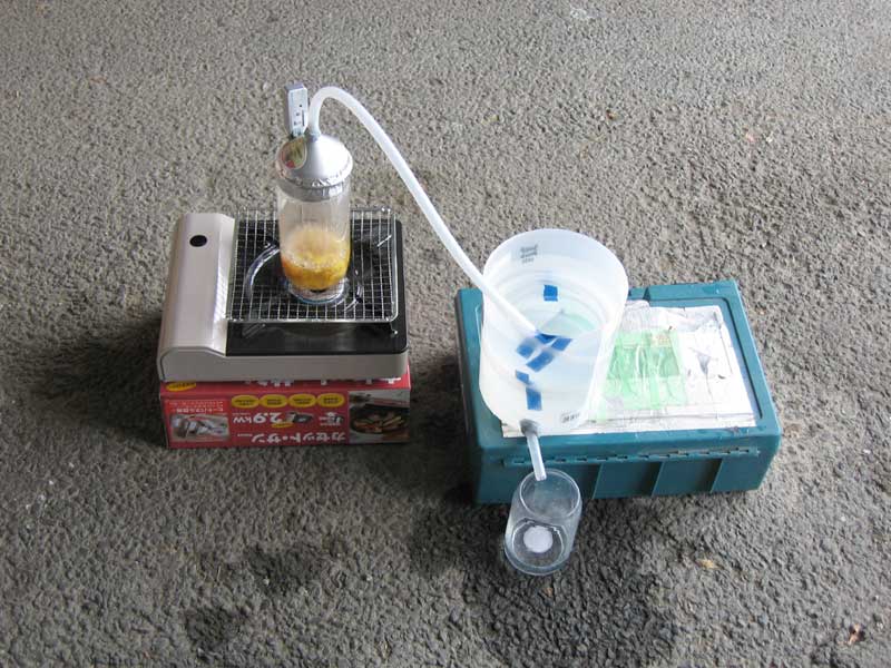 そんな中ビオトープの提出書類を作成していたら、BDFチームが実験していると言う知らせが入ったので取材に向かいました。実験内容は自作の蒸留装置の実証実験でした。専用の実験室がないので車庫での実験です。蒸留装置で煮詰めているのはカリンだそうです。辺りに良い香りが漂っていました。この実験を応用してBDFの精製に応用することを目論んでいる様です。