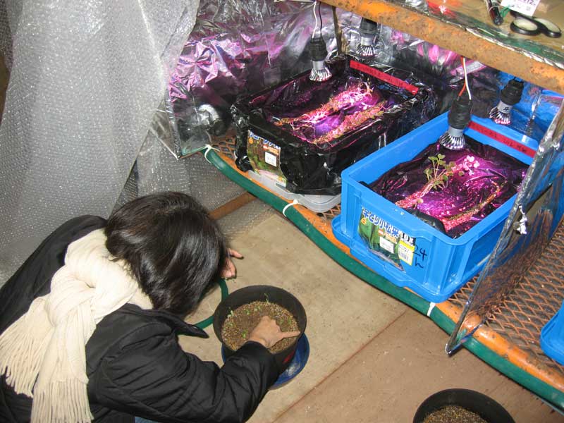 LEDの増設は配線を切ったり繋いだりと言う作業です。冷え込む現場での細かい作業になりました。一方、おろぬきもまた繊細な作業です。まだ土中にしっかり根付いていないので、隣の苗が抜けない様に一本ずつ引っ張って抜き進めます。抜いたものはまだ成長するかもしれないと言う事で用意してあった植木鉢に植え替えました。太陽光チームの暖かい部屋に移動して栽培する事になりました。