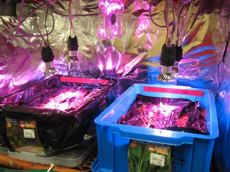 一方、LEDによるサニーレタスの生育は芳しくありません。小松菜は比較的生長が進んでいました。イチゴは発芽数が増えたようですが、あまり大きくなっている様には見えません。何か別の手段を考えなくてはならない時期にあるのでしょうか。