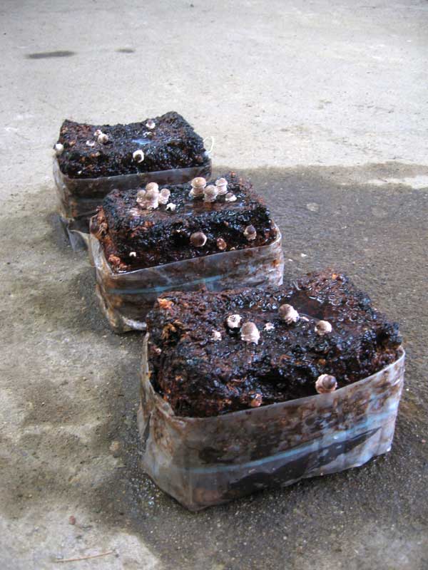 そんな時、椎茸菌床ブロックが到着。開封すると菌床ブロックは既に幾つか発芽していました。全部で4個のブロックのうち、ひとつは青色LEDをセット。ひとつは光のない状態のものをセット。ひとつは光のない状態で植物工場外の寒い環境にセットしました。そして残るひとつは専門校の教室内に置く事にしました。椎茸の菌床ブロックについて調べていた仲間が菌床ブロックに水分を与えます。しばらくおいて各々のセットポジションに設置しました。条件が4通りありますが、約1週間から10日ほどの間にどの条件の椎茸が良好な生育をするのか観察して行く事になります。