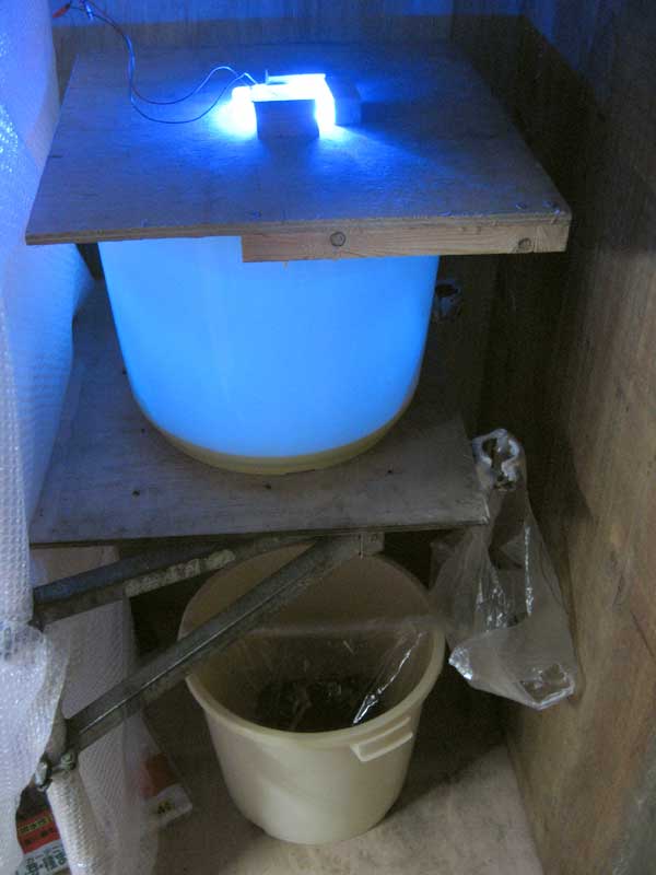 今日は椎茸の菌床ブロックが届く事になっていました。車に乗り合わせ、植物工場のある現場へ向かいました。現場に着くと、あらかじめ予定していた作業に取りかかります。LEDによる植物栽培用の棚に椎茸栽培の棚を増設します。そして、栽培用に使用するプラスチックの漬け物桶の蓋を作り、システム担当の仲間が事前に青色LEDの回路を組み込んだ基盤をセットします。