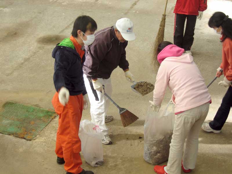 さて、道具を揃えて現場に集まった仲間で設備を組み立てる為の場所の清掃です。もうもうと立ち込めるホコリの中、お借りした場所を手分けして掃き掃除です。リーダーが中心になって着々と計画を立ててきました。いよいよそれを実行する時なのです。