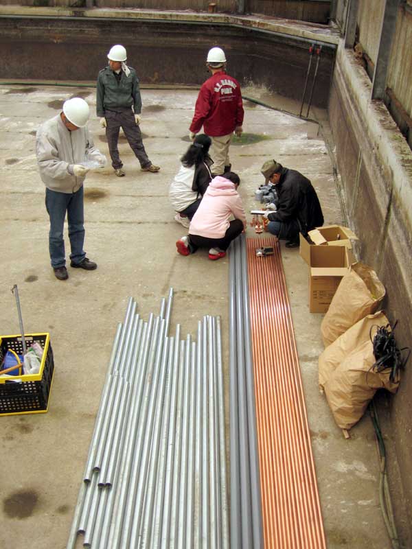 材料は経費を抑える為に養鶏の実証試験で使ったものを再利用したりしていますが、配管についてはメンバーが手配した新品の銅管が用意されました。