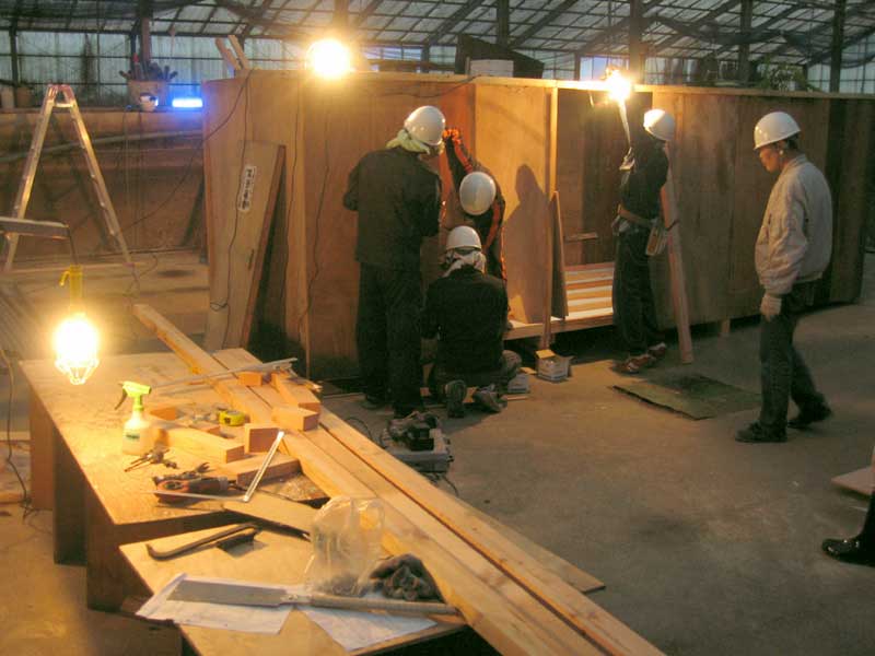 まずは手分けして材料の搬入から開始です。そして親方が木材のカットし、指示を仰ぎながらの組み立てです。お昼過ぎになって形が出来上がってきました。