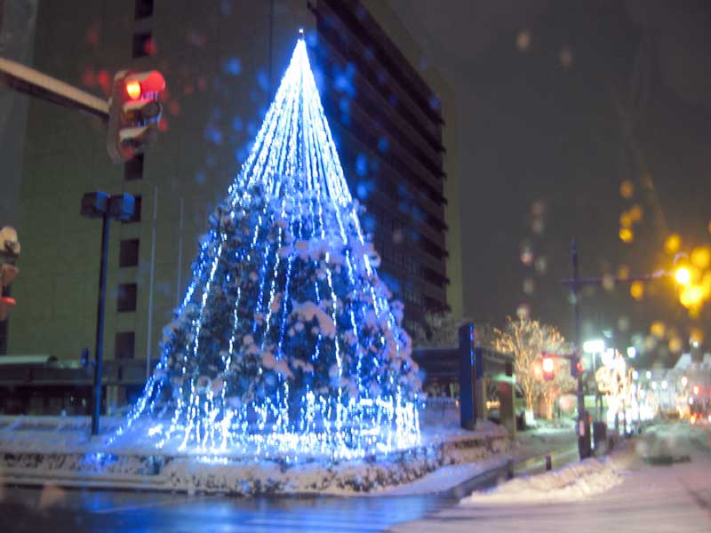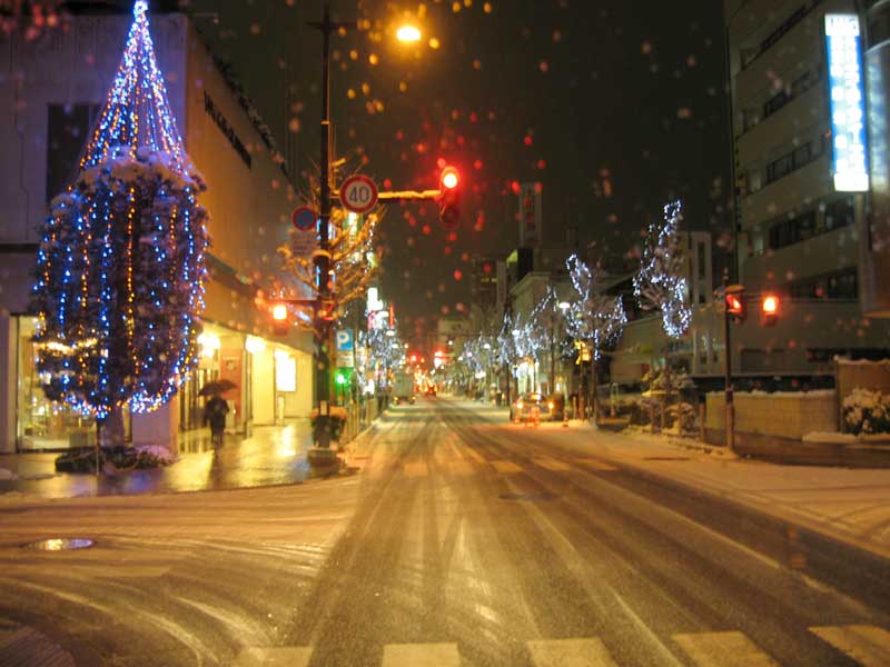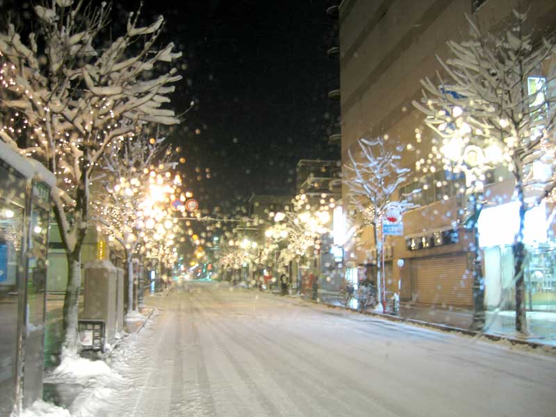 今日は山形市の初市があったと言う事で車両の交通規制があったそうです。そしてもうひとつの仕事とは、その交通規制に使ったトラ柵や案内板などを回収する仕事でした。イルミネーションが彩る七日町通り商店街をトラックで縦横無尽に移動しながら回収作業を進めます。…といっても、専門校仲間が警備員の方と組んで作業するのを助手席で眺めていただけでしたが、こう言う縁の下の力持ちと言うか、黒子的役割を担う人が街の活動を支えているのですね。しんしんと雪が降り続く中、回収した器具を返却し、今日の作業は終了となりました。