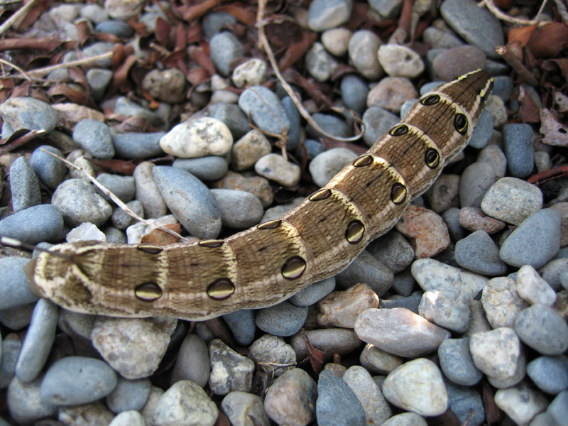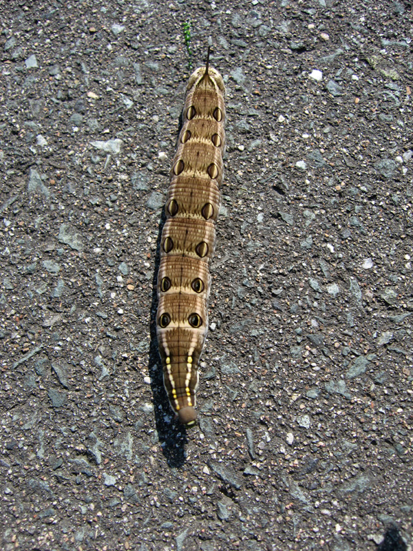 そんなことを考えながら天童から山形方面へ自転車を走らせていたら、歩道を歩く一匹のイモムシに出会いました。どこから来たのか解りませんがとにかく焦っています。急いでいる理由は間もなく判明しました。この猛暑で歩道のアスファルトが高熱になっているのです。そのイモムシは、昨年も出会っていたのでスズメガのイモムシであることはすぐに解りました。セスジスズメの5令と言うことになると思います。何とも立派なイモムシでお尻の先にアンテナの様な尻尾があります。スズメガは蛾の一種と言っても一般的な蛾とは少しばかり様子が違います。スズメガの一種であるオオスカシバは蛾であるにも関わらず羽根は蝉のように透明であり、蜂のように高速で飛び回り花の蜜を吸います。セスジスズメの生態は詳しく知りませんが、成虫はスズメガらしくシャープなデザインをしています。幼虫時代は大量の植物を食害すると言うことで害虫として認識されることもある様ですが、刺すわけでもなく噛みつくわけでもなく集団で樹の葉を食べ尽くすわけでもなく、ましてや高温のアスファルトの上を一生懸命走っている姿は憎めないのでした。それで、手を差し出したらやっぱりアスファルトが熱かったらしく手の上に急いで上ってきます。そして落ち着いてしまいました。(笑)その体温たるや熱湯を入れた風船の様な熱さです。よくこの体温で生きていられるものだと感心してしまう程です。ただ、刺さないことも噛まないことも解っていても相手はイモムシです。手のひらで落ち着かれてしまっては余り気持ちのいいものではありません。(笑)慌てて日陰に降ろしてやるとホッとしたように落ち着いてうずくまってしまいました。