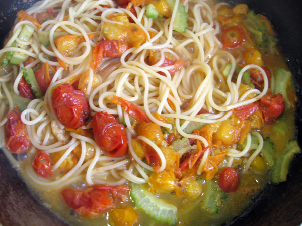 いただき物のミニトマトと冷蔵庫にあったゴーヤを使ってスパゲティにしました。塩コショウしかしていないのに驚く程に酸味とコクが出てとても美味しくいただきました。