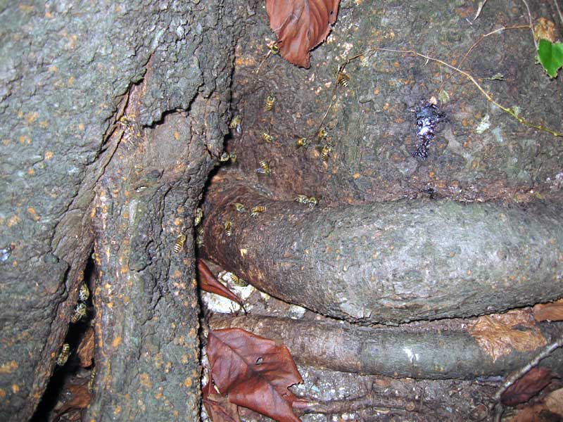 先日、観察していた自然のミツバチの巣を覗いて見ると、夕暮れ時でミツバチ達も帰宅していた様子です。激しい様子は見られませんが、何匹かのミツバチが耳元をかすめて戻って来ていました。越冬するのでしょうか。