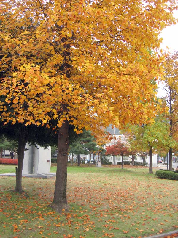 美術館脇の歩道は色鮮やかな紅葉です。色の美しさももちろんですが、人間がその色の変化を美しいと感じる存在であることも不思議です。人間以外の動物が違う人間の可視領域とは違う光の波長を感じ取っていると言う話は聞きますが、美しいと感じられる光の波長が人間に限定されたものであるとすれば、この感動の源泉はどこにあるのでしょう。また眼を持たず、移動することも出来ない植物にとってこの世界はどんな風に感じられているのでしょう。眼に見えるもの。手に触れるもの。聴こえてくる音。感じられる匂い。そして、味わい。人間は、五感を駆使して結晶化した世界を現実として認識していますが、実はそれが真実であるとは限らないことになります。利己的で自己中心的になれば世界は限定され、その中にしか真実を見出せなくなります。情報過多な現代社会で如何に道を見つけだすのか問われているのでしょう。