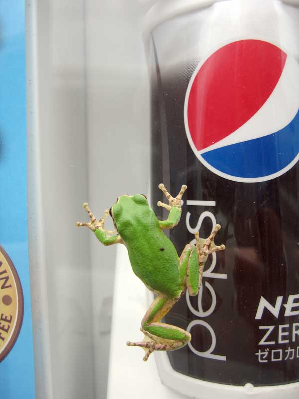 朝は小雨模様。そして強い風が吹きました。訓練校の近くの自動販売機にアマガエルを見つけました。ジュースが飲みたくなったのでしょうか?