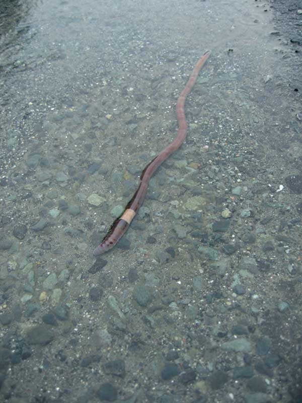 朝から冷たい雨の降る日でした。駐車場の水たまりを大きなミミズが遊泳しています。