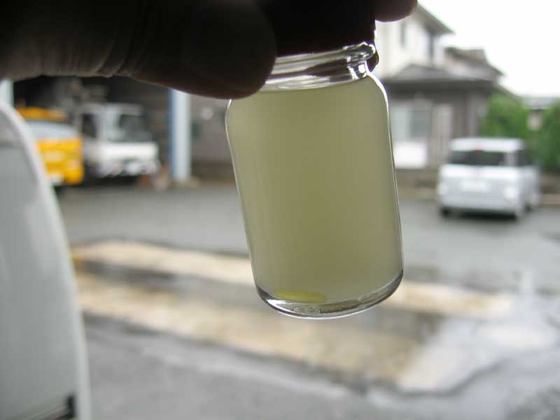 BDFの品質検査は取り寄せた検査薬を20度以上に温める必要があります。今日は気温が低かったので体温で温めたりして25℃まで温度を上げて検査しました。透明な試験薬にBDFを入れて良く振り混ぜます。最初はするりと混ざって少しばかり白っぽく濁りましたが、不純物は見当たりません。ところがそれから10分後、残念ながら不純物が固まり始めてしまいました。白っぽく濁るのは水分が含まれているからとのことで、このまま車の燃料として使うことは出来ないと言う結論に達しました。
