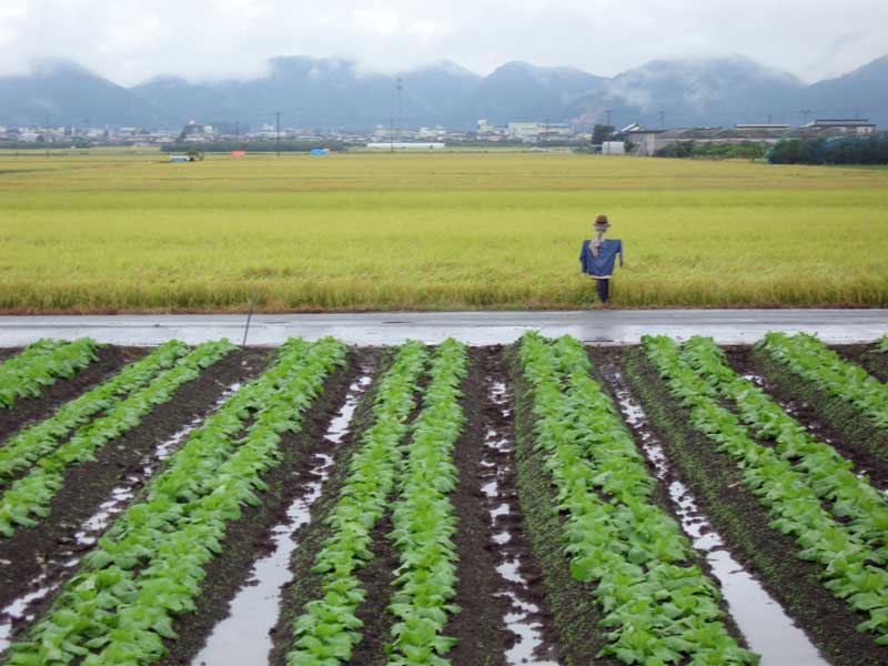 実りの季節を迎えた黄金色の田園風景の中、案山子が得意げに見えました。