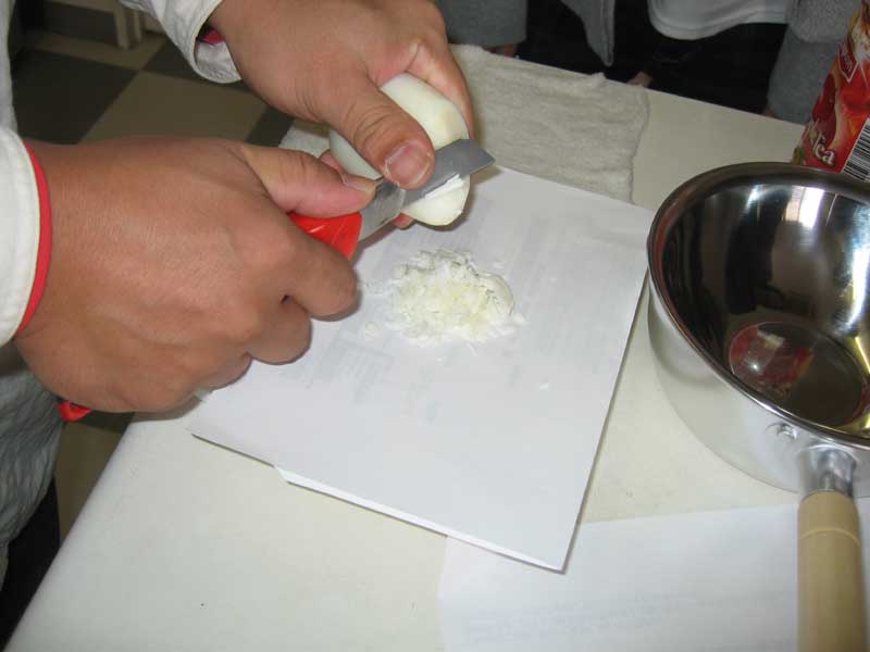 今日の訓練校は、昨日に引き続き受験コースと実践コースに分かれて活動でした。実践コースはBDFの実験で固形化にチャレンジです。まずは純石鹸を細かくする所からスタートです。きっちり重さを量り、湯煎にかける為、お湯でBDFを温めます。温度を計測し、頃合いを見計らって細かくした石鹸を投入しました。それからしばらく石鹸が溶けやすい様にかき混ぜました。しかし、なかなか溶けません。さらに混ぜ続けます。でもやっぱり溶けません。これは俗に言う失敗でしょうか。