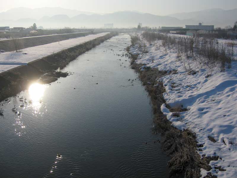 朝から良いお天気なので自転車で走るには申し分ありません。雪の心配がなさそうだったので、防寒具と衣類を一枚ずつ減らして自転車を走らせます。日の出が早くなったのでしょう。いつもの時間より早く自宅を出たのに朝陽は思ったより高くなっていました。黄金色の朝陽が空に輝き、雪原は蒼き眠りから目覚めようとしています。まるで絵画の中に暮らしているようです。通りかかった川辺には今朝も鴨や白鳥が眠りから覚め活動を始めようとしています。