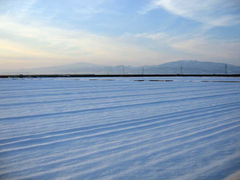 午後、仲間と少し話をしてから家路に就きました。冬を越える間に足の筋肉が増強されたのか、ペダルを踏むのが楽な様に感じます。陽は西に傾き、夕暮れを迎えようとしていました。葉山の向こうには月山が泰然と聳えています。ふいに山形で暮らしているのだと言う実感が湧いてきました。県外生活が長かった為か山形への郷愁も強かったのです。けれどそれも11年の間にすっかり慣れてしまいました。それで普段「山形」を意識する事は少なくなったのですが、何かの弾みに突然、郷愁のような満足感のような感覚が湧いてくる事があるのです。葉山と月山は、その象徴的な存在でもあります。暮れて行く空を鳥達の群が家路を急いでいる様でした。