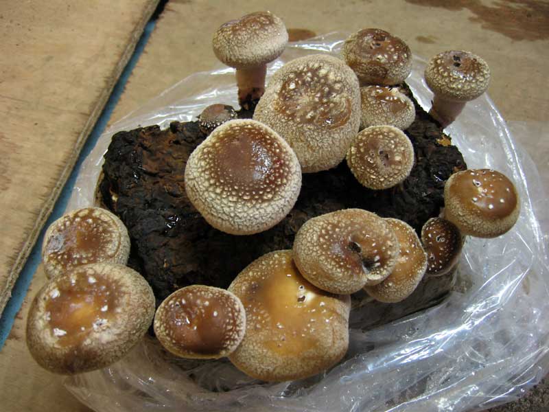 IMG_3206.jpg 一方、低温で栽培していた菌床を暖かいところに移したら見事復活。しもやけのような傷が見られますが、むしろしっかりした椎茸になっているようにも見えます。考えようによっては、低温の場所に置くことによって栽培時期のコントロールが可能になると言うことになります。2本だけ収穫して後は栽培続行です。また2日もすれば収穫可能になるでしょう。休眠させている菌床は一部カビが見られましたが、特に異常なしと言うところです。収穫した椎茸は専門校の仲間が生でポリポリ食べてしまいました。(笑)