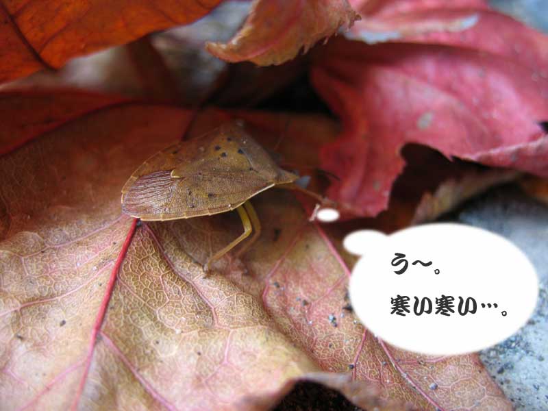 二日ぶりに外出しようと玄関を出たら吹き寄せられた落ち葉の中にカメムシが潜り込もうとしていました。空は晴れ渡り、街路樹の葉も随分落ちた様子です。