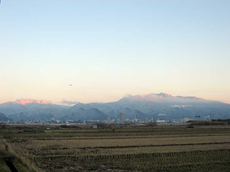 日本人が雑草を食べる様になれば、国内の食料自給率は一気に上がると言う冗談話をしつつ専門校を出ると雪をまとった西蔵王が夕日に映えていました。夕方の寒空をモーターパラグライダーが飛んでいました。
