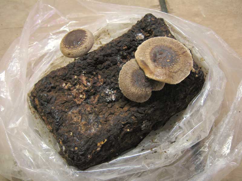 一方、椎茸はと言えば、青色LEDで栽培している菌床のみが発芽し成長しています。前回と違うブロックで試しているのですが、発生数が激減しています。これが2回目だからなのか他に原因があるのか特定出来ずにいます。言える事は、発生数は少なくても他の光を当てない菌床よりずっと早く成長していると言う事です。試しに他の菌床に青色LEDを照射して様子を見る事にしました。