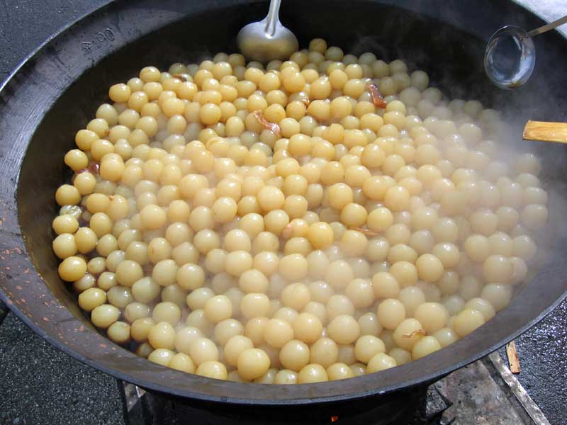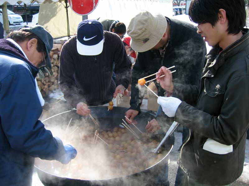 何とか準備をしてあとはワイワイこんにゃくを煮込みます。出来上がりの時間を見通しながら計画するのですが、何と言っても1,000人分です。こんにゃくが出来てから串に刺すのが結構大変でした。それと言うのも串で刺すと後が危険だと言うことで割り箸を使ったのです。サギ用は手間を取り提供するまで随分手間取ってしまいました。それでも作業する方も薪や炭の煙との闘いです。目を赤くしたり涙を流したりして何とか早く温かいものをお届け出来る様頑張りました。一体、今日の出来事はボランティアだったのか実感はありません。