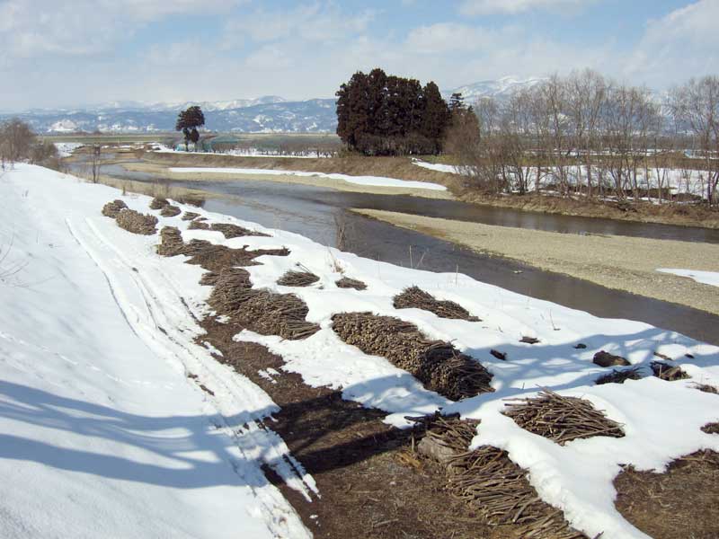 さて、今日は天候も良かったので、ひとりで植物工場実験室へ自転車を走らせる事にしました。仲間にはこの冬の間、すっかり負担をかけてしまっていますから、少しくらい頑張らなくちゃです。途中、乱川に差し掛かると河川敷の木々を伐採して積んでいました。昨年からやっているようですが、公共の仕事には見えなかったのでちょっと気になりました。